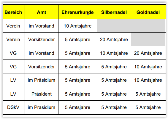 Es werden in der Tabelle die Amtsjahre, die für den Erhalt einer bestimmten Ehrung notwendig sind, aufgeführt.